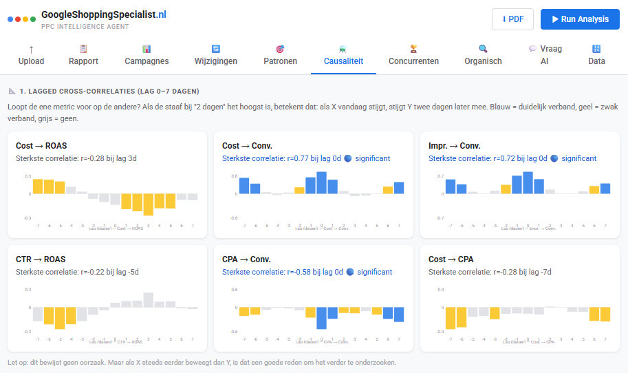 De grafiek in het causaliteitsblad laat per paar metrics zien bij welke lag de correlatie het sterkst is. Blauw betekent een duidelijk verband, geel een zwak verband, grijs geen verband. Is de sterkste staaf bij lag 2, dan beweegt metric Y twee dagen na metric X.