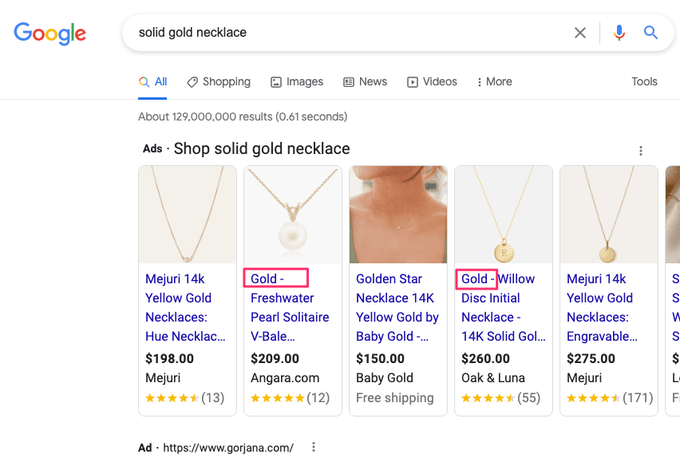 Google lijkt willekeurig deze materialen voor de titel te hebben gezet, om relevantie te vergroten. Woorden die verder vooraan in de titel staan bij een Google productvermelding (Shopping), wegen zwaarder dan achter in de titel. Doordat de zoekopdracht het materiaal goud bevat, probeert Google hierbij de producttitel voor de gebruiker relevanter te maken door ”Goud” voor de producttitel te zetten.
