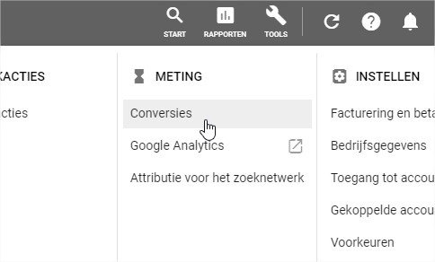 Deze informatie wordt toegeschreven aan de juiste advertenties en zoektermen, en is dus onmisbare informatie om actie op te ondernemen. Een conversietracker bestaat uit een stukje code, welke je uit Google Ads haalt. Maak een conversietracker aan door te navigeren naar ‘Tools’ in het bovenmenu, en kies vervolgens ‘Conversies’: