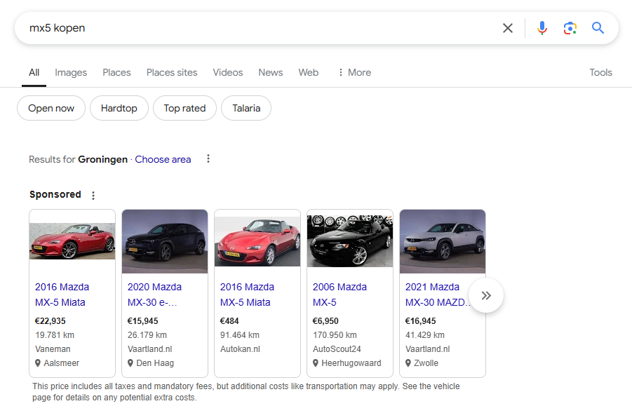Zie hieronder enkele screenshots. Het valt ook direct op, bij deze maar ook vele andere zoekopdrachten, dat de matching de uitdaging is. Bij de MX5 matched het ook de MX-30. Dat maakt voor MX-5 aanbieders misschien niet heel veel uit, maar als je de MX-30 aanbiedt in non-MX-30 zoekopdrachten, doet dat af aan de kwaliteitsscore.