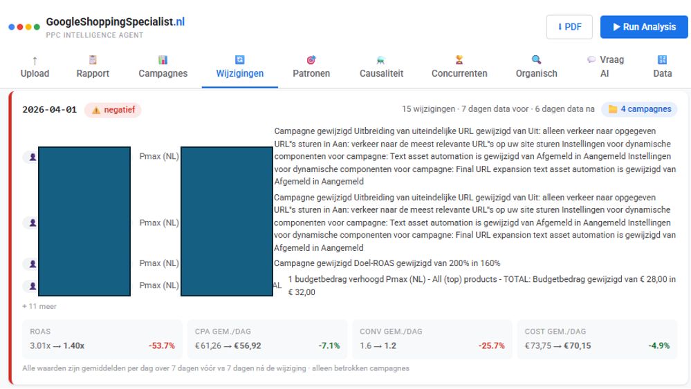 Wat doe je? Je gaat terug naar het dashboard. Je zoekt handmatig door de wijzigingshistorie. Je probeert te reconstrueren wat er is veranderd, wanneer het veranderde en of het aan jouw ingreep lag of aan iets buiten je campagnes.