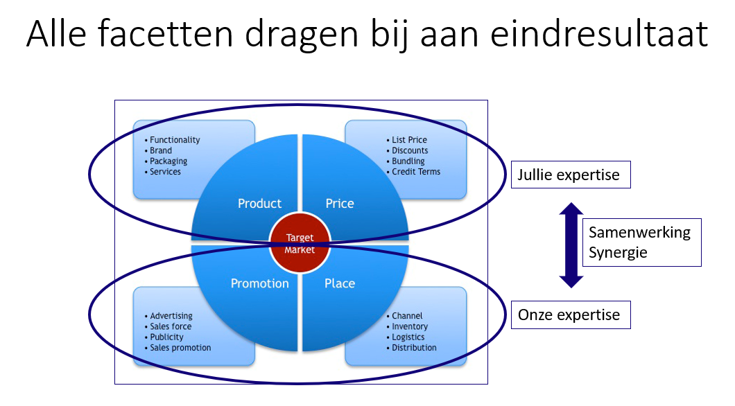 Wij excelleren daarentegen weer in de marketing P’s promotie en plaats (website & platforms).